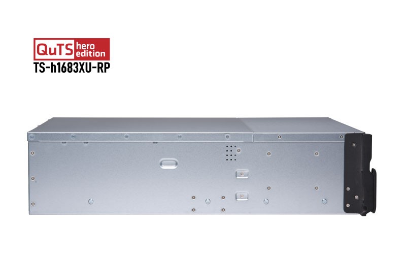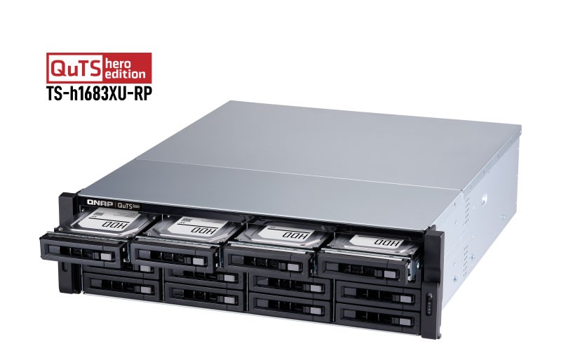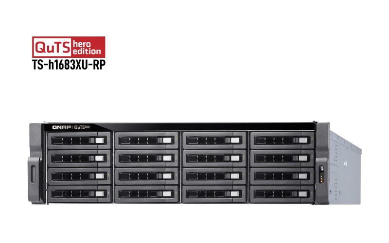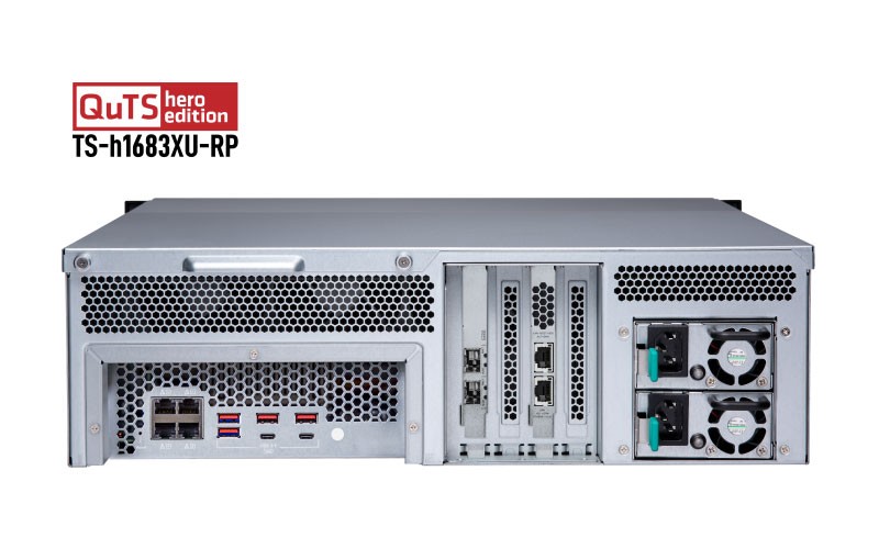 O TS-h1683XU-RP é um NAS com 16 baias para HDDs SATA com hot swappable e fonte redundante. É equipado com um processador Intel Xeon E 2236, 128 GB memória UDIMM DDR4 ECC, 2 portas 10GbE SFP + SmartNIC. Possui sistema operacional QuTS hero baseado em ZFS, criptografia AES-NI e virtualização.