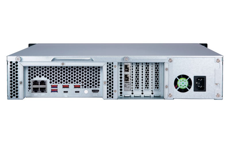O TVS-872XU possui 8 baias para discos SATA de 3,5 polegadas de 6Gb/s de até 96TB, e hot-swappable. Equipado com processador Intel Core i3 4-core, 4GB de memória, 4 portas LAN gigabit, 2 portas 10GbE, 1 HDMI, 4 slots PCIe para instalação de placas adicionais e placa Mellanox 10GbE para aumentar o compartilhamento intensivo de arquivos e backups ou aplicativos de virtualização. Oferece transcodificação de vídeo e a saída HDMI 4K 2.0 pode exibir vídeos de vigilância em um monitor ou TV.