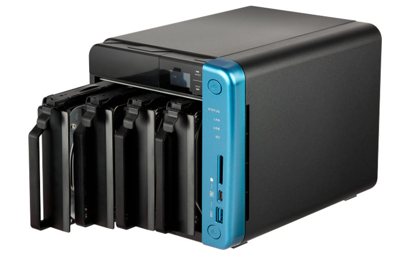 O TS-453B apresenta um design totalmente novo com uma tampa deslizante. A instalação do disco rígido de 3,5 ”sem ferramentas torna mais fácil para os usuários configurar e manter o TS-453B. O painel frontal OLED exibe informações do sistema (incluindo temperaturas, velocidade do ventilador e a capacidade dos discos rígidos, volumes e LUN), permitindo que você visualize rapidamente o status geral do sistema. Os botões de toque capacitivos à prova de poeira permitem que você acorde facilmente a tela, altere as configurações de IP da rede e a senha do host ou até mesmo reinicie e desligue o sistema.