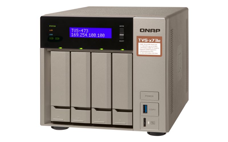 O TVS-473e é alimentado por um processador quad-core AMD R-Series RX-421BD de 2,1 GHz turbo Core até 3,4 GHz com desempenho gráfico AMD Radeon ™ R7, oferecendo uma solução NAS de alto desempenho e economia de energia. Além das 4 baias hot-swap, o NAS Qnap também conta com 8 GB (até 64GB) de RAM, 56TB, 2 slots SSD M.2, 4 portas gigabit RJ45, 1 porta USB micro-B, 4 portas USB 3.0 e 2 saídas HDMI 1.4b. O Storage Qnap também fornece de slots de expansão PCIe, porta USB QuickAccess, armazenamento escalável, virtualização, backup, compartilhamento e recuperação de desastres.