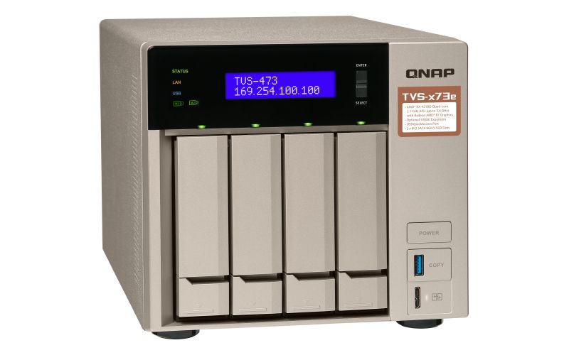 Equipado com um APU Next-Gen AMD R-série RX-421BD Quad-Core 2,1 GHz (picos de até 3,4 GHz) e podendo atingir até 64GB de RAM, o TVS-473e permite a realização de diversas tarefas com baixo consumo de energia para até 1106 MB/s throughput em configurado em 10GbE. O Qnap NAS também oferece um desempenho de criptografia com um mecanismo de criptografia de aceleração por hardware com o AES-NI (até 1091 MB/s com criptografia de volume NAS completa AES 256-bit) aumentando o desempenho do sistema e garantindo a segurança de dados corporativos armazenados no NAS.